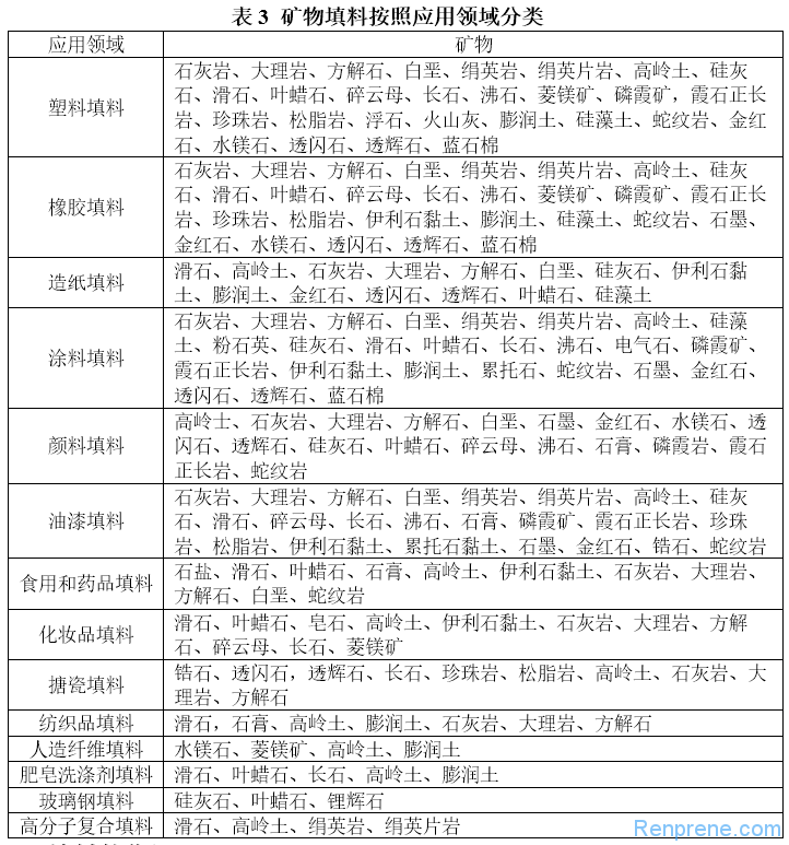 可作为矿物填料的矿种很多,用途也很广,按填料应用领城分类见表3。